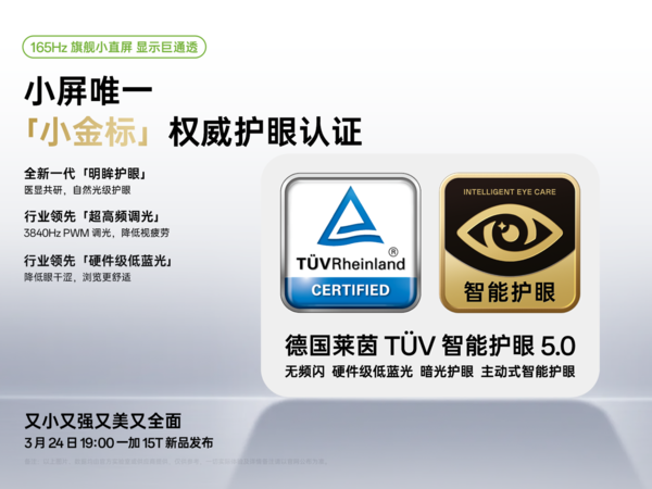 护眼是一加15T的另一重点。该机搭载“明眸护眼”技术,结合硬件级低蓝光与0.04 SVM的低频闪表现,配合七大AI主动护眼功能,获得了小屏手机唯一的“小金标”护眼认证。