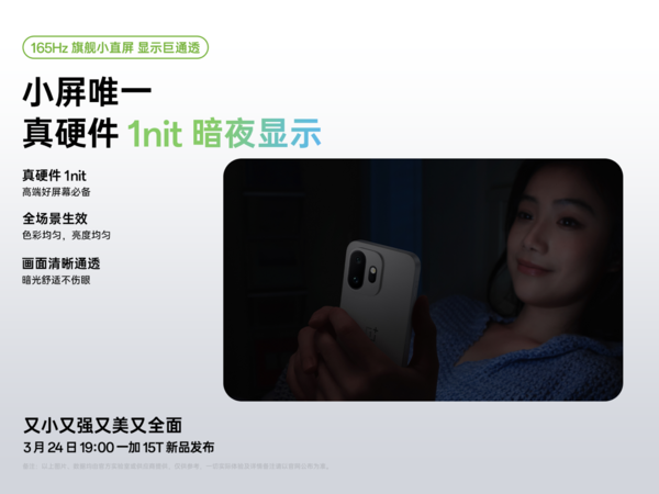 【CNMO科技消息】3月23日,一加宣布全新小屏旗舰一加15T将配备6.32英寸165Hz旗舰级小直屏,成为小屏手机市场中唯一支持165Hz超高刷新率的机型。