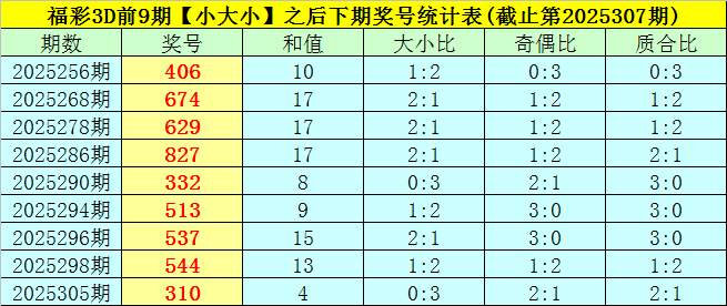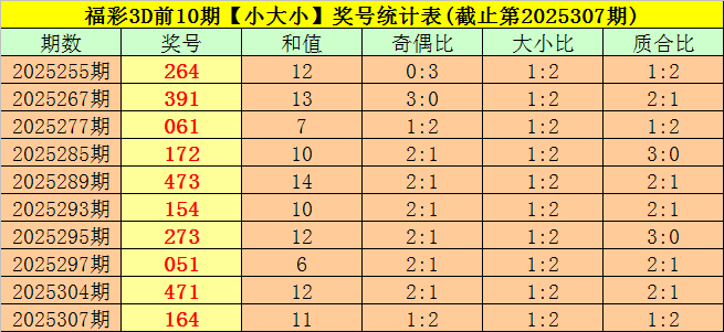 一、上期回顾:福彩3D第2025307期奖号为:164,奖号类型开出组六,大小比为1:2,奇偶比为1:2,和值为11,跨度为5,012路比为1:2:0。