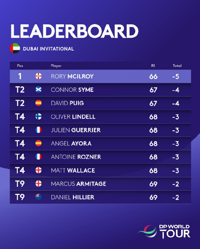 苏格兰选手康纳·赛姆(Connor Syme)与西班牙选手大卫·普伊吉(David Puig)均以67杆,低于标准杆4杆,紧随麦克罗伊之后。