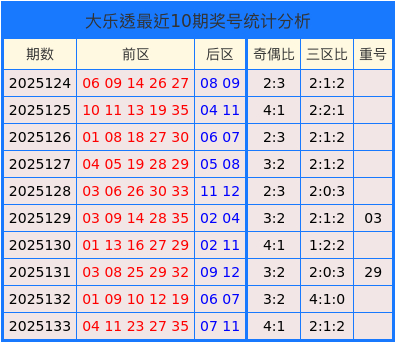 重号分析:上期前区无重号。最近10期有2期开出重号组合,开出重号组合的概率为20.00%。本期预计不开出重号。