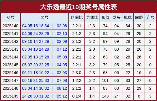 奇偶分析:上期前区开出偶数较多,本期重点关注奇数前区大热,参考奇偶比3:2。