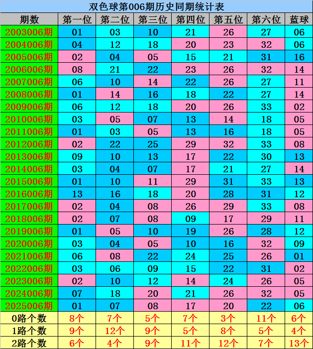 第一位:历史同期0路红球开出:03、06、09;1路红球开出;01、04、07、13;2路红球开出;02、08,红球012路个数比为8:9:6,当前0路红球历史同期轮空3年,今年同期注意0路红球出现,参考号码06。