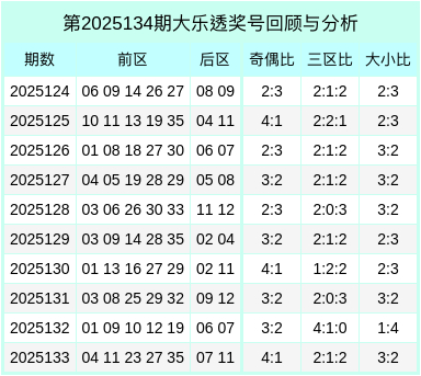 当期前区号码大小比为3:2,三区比为2:1:2,奇偶比为4:1。